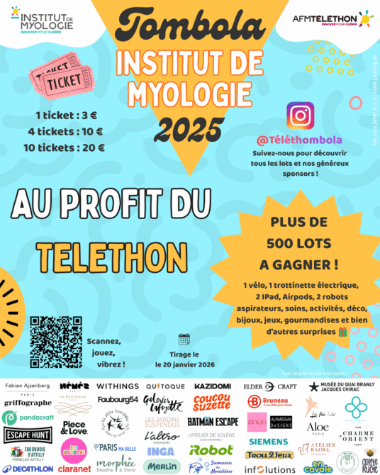 Nous sommes heureux de vous annoncer le lancement du Téléthon de l’Institut sur le site de l’hôpital de la Pitié-Salpêtrière, Paris 13ème, dès le mois de novembre.