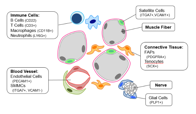 Adult tissue repair and regeneration require stem-progenitor cells that can self-renew and generate differentiated progeny. Skeletal muscle regenerative capacity relies on muscle satellite cells (MuSCs) and their interplay with different cell types within the niche. However, the understanding of skeletal muscle tissue cellular composition is limited.