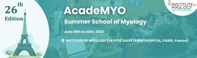 “The 26th AcadeMYO-Summer School of Myology 2025, Institute of Myology, Paris, France 16/06/2025-20/06/2025, has been accredited by the European Accreditation Council for Continuing Medical Education (EACCME®) with 29.5 European CME credits (ECMEC®s). Each medical specialist should claim only those hours of credit that he/she actually spent in the educational activity.” |